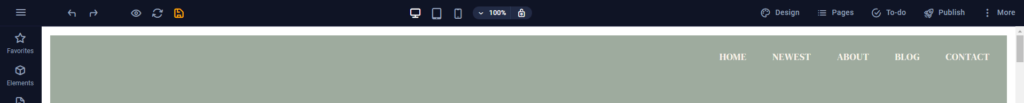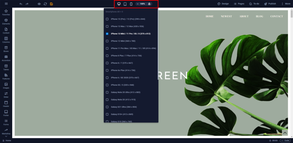 In het midden van de navigatie bovenaan kunt u kiezen tussen een desktop-, tablet- en mobiele weergave om uw website op alle apparaten te bekijken en indien nodig de responsieve instellingen aan te passen.