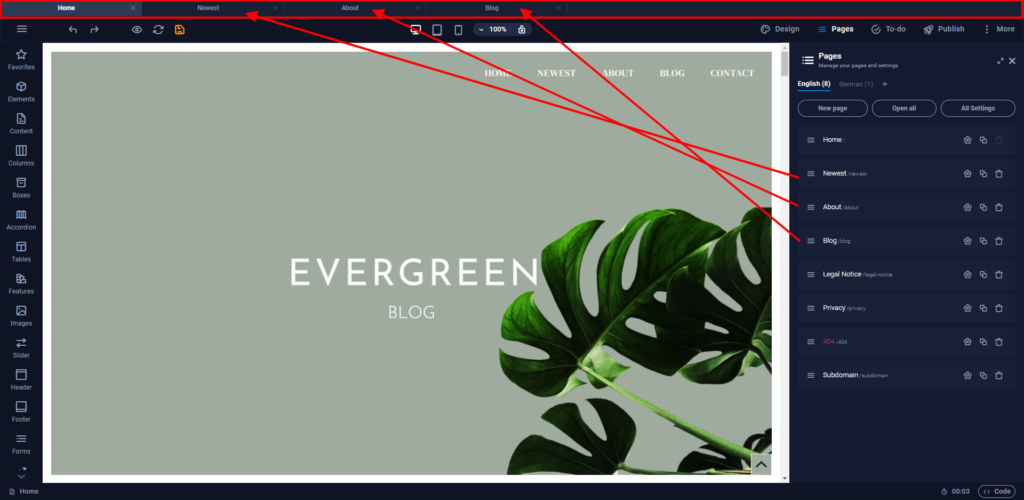Onder Pagina's vindt u alle subpagina's van een website. U kunt nieuwe subpagina's toevoegen, URL's en paginanamen bewerken, sitespecifieke meta-informatie toevoegen, een subpagina beveiligen met een wachtwoord en bepalen of een subpagina door zoekmachines moet worden vermeld. Elke subpagina wordt geopend als een tabblad boven de navigatie bovenaan.