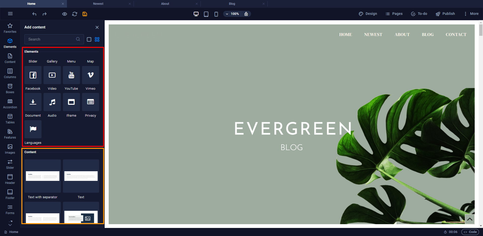 De inhoud-zijbalk aan de linkerkant is gesegmenteerd in verschillende categorieën, waardoor u eenvoudig nieuwe inhoud aan uw website kunt toevoegen. In de inhoud-zijbalk maken we onderscheid tussen elementen die individuele componenten zijn, zoals koppen, teksten of afbeeldingen, en voorinstellingen, die vooraf gebouwde websitesecties zijn die uit verschillende elementen bestaan. Voorbeelden van presets zijn accordeons, afbeeldingsgalerijen of prijstabellen. Elementen worden weergegeven met pictogrammen (voorbeelden staan in het rode vak) en voorinstellingen (oranje vak) worden weergegeven met miniaturen die u een voorbeeld geven van het websitegedeelte: