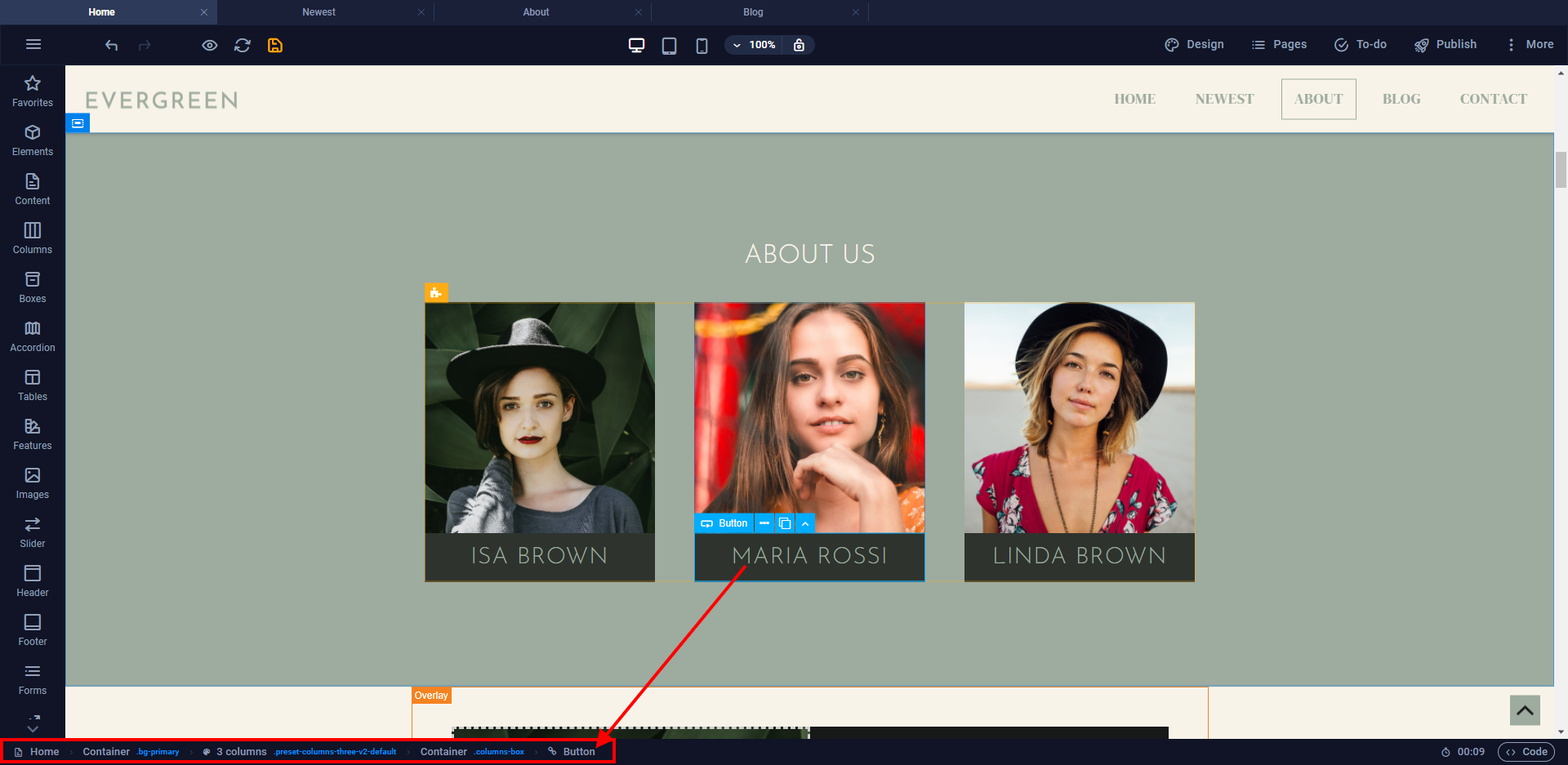 Zoals je in deze afbeelding kunt zien, hebben we op een knopelement geklikt dat is genest in een container die deel uitmaakt van de voorinstelling met 3 kolommen, enz.: