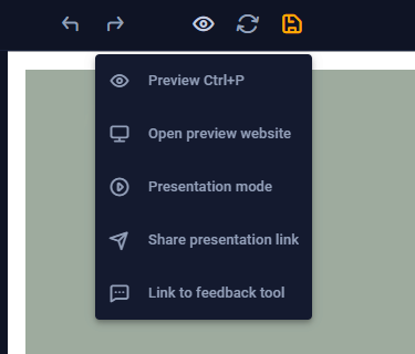 Wanneer u op het oogpictogram klikt (of Ctrl + P gebruikt) kunt u een voorbeeld van uw website bekijken in de website-editor - daarom noemen we dit het voorbeeldpictogram. Met deze preview-functie in de website-editor kunt u wijzigingen die nog niet zijn opgeslagen, controleren en testen. als u over het voorbeeldpictogram beweegt, ziet u een vervolgkeuzelijst met extra voorbeeldopties: