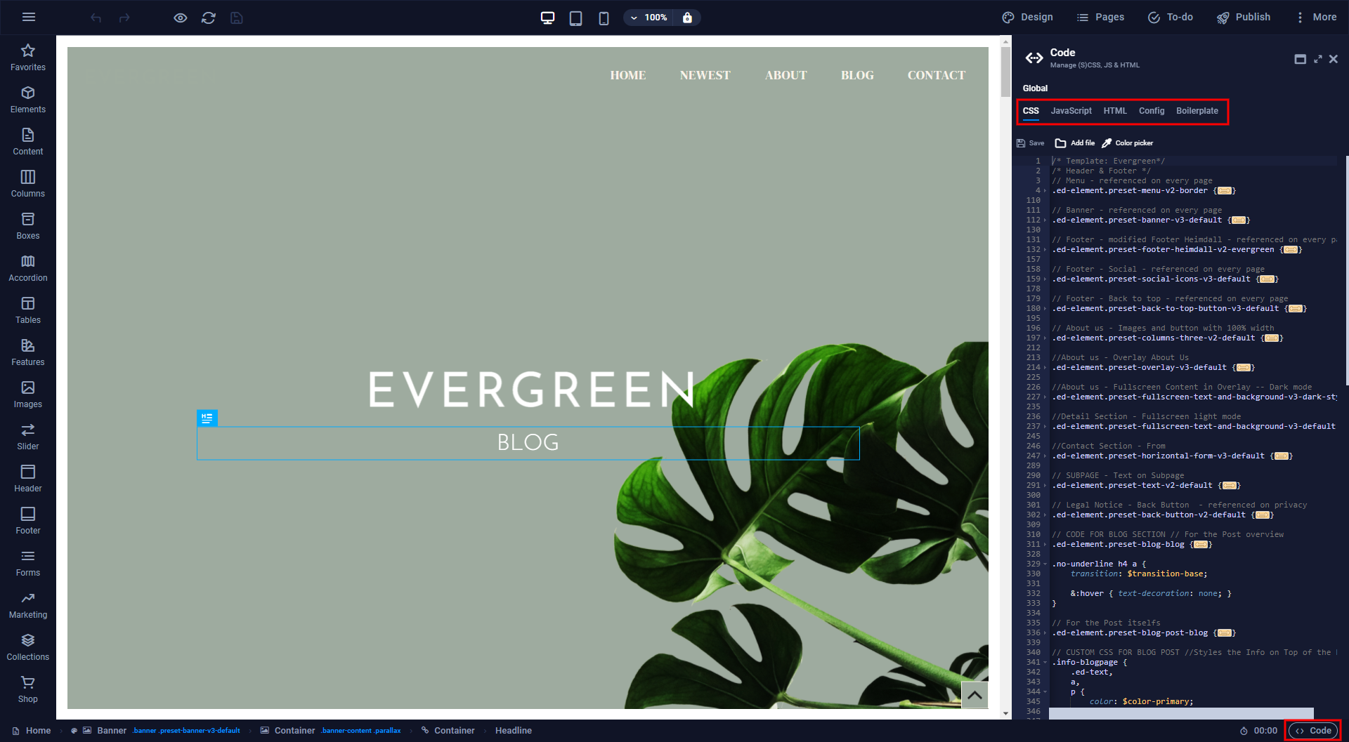 CSS-, JavaScript- en HTML-code kunnen vanuit de code-editor worden bewerkt. Deze kunt u bereiken door rechtsonder in de Website Builder (CMS) op "<> Code" te klikken. Je kunt de code-editor ook openen met de toetsencombinatie [Ctrl] + [Alt] + [C].