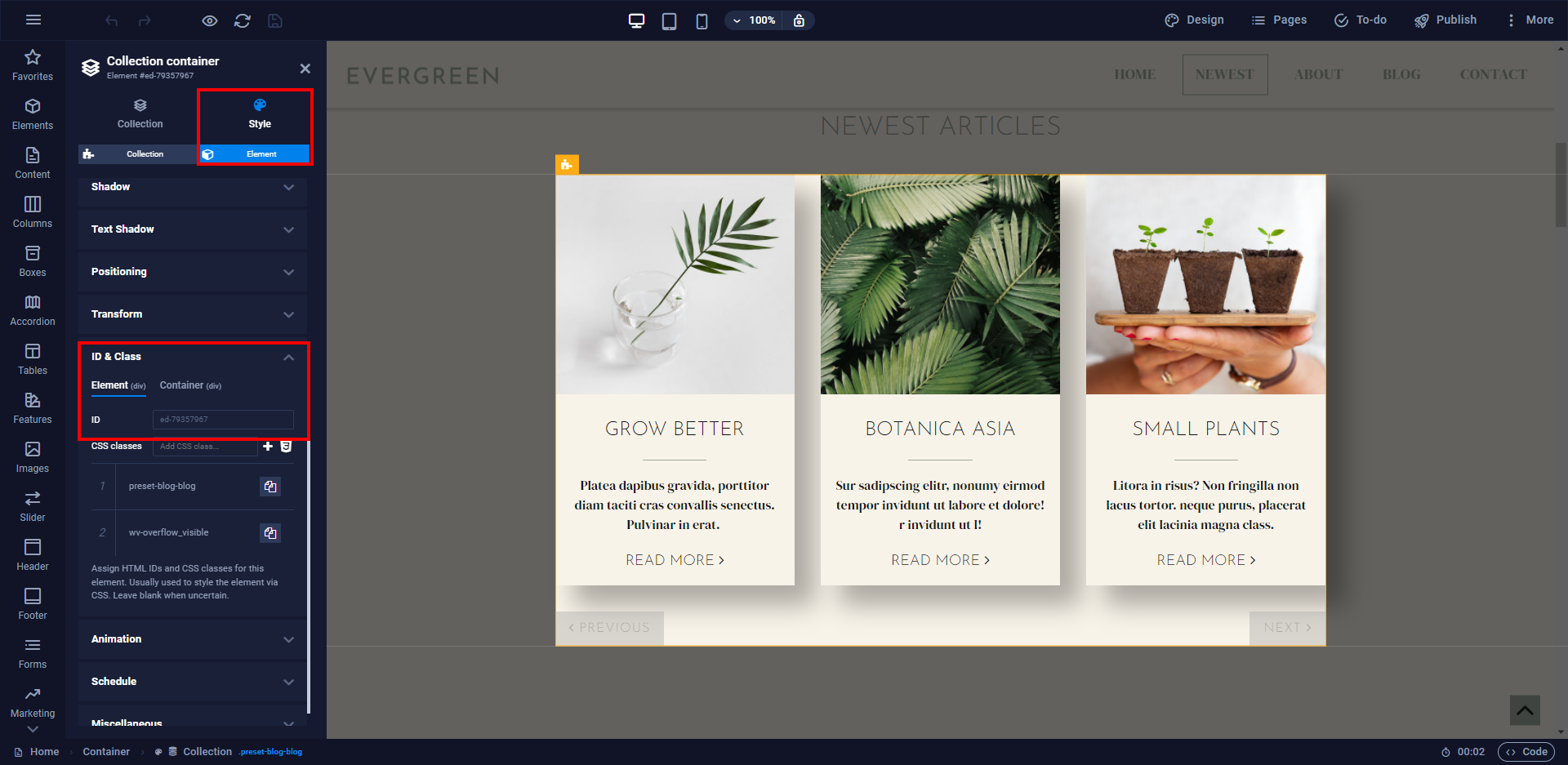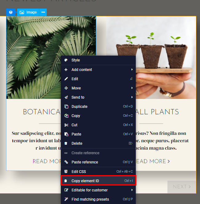 Elk element in de website builder heeft zijn eigen unieke ID. Het ID heeft altijd de indeling #ed-xxxxxx. Je kunt het vinden in de elementeigenschappen, die toegankelijk zijn via de volgende methoden: