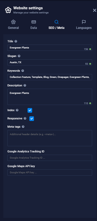 Hier kunt u alle relevante meta-informatie over uw website invoeren. Dit kunnen titels, trefwoorden of een korte beschrijving zijn. Meer informatie over SEO vindt u in ons SEO-artikel .