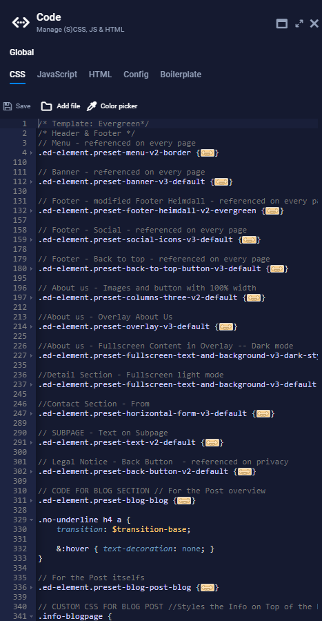 Hier kunt u uw eigen CSS-stijlen toevoegen, die vervolgens op de website kunnen worden toegepast. Als u presets gebruikt, worden deze hier vastgelegd en kunt u uw overschrijvingen aan de betreffende secties toevoegen. U kunt alle variabelen gebruiken die zijn gedefinieerd op de tabbladen "Boilerplate" of "Config".